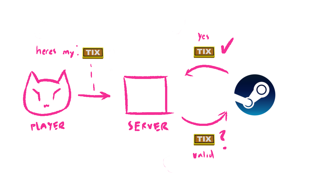 Today, most games are played through launchers and platforms such as Steam that provide built-in player authentication for multiplayer games through their backend services. They use session tickets that are automatically generated for the client, then handed to a game server, which sends the ticket to Steam’s backend to verify the client’s identity and authority to be in the game. This lets the game server confidently say that you are the real John Halo from Steam in my competitive Aztec match on Counter Strike 2! Neat! You can play the game I guess.