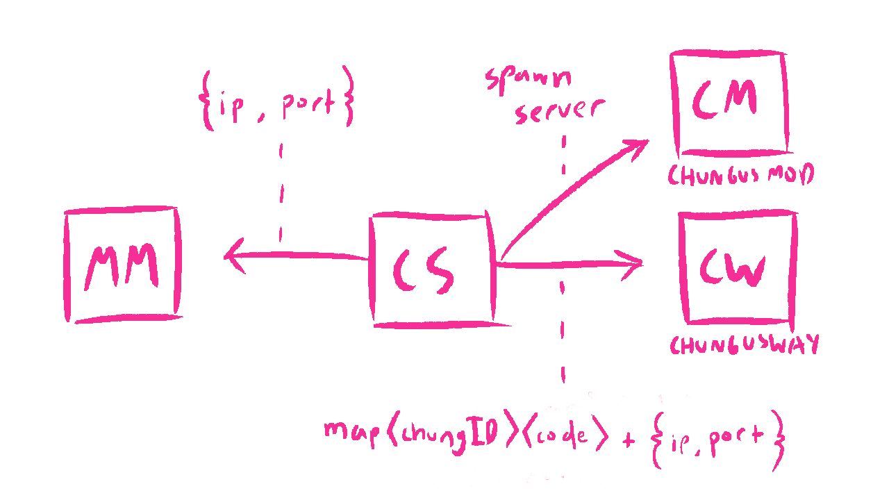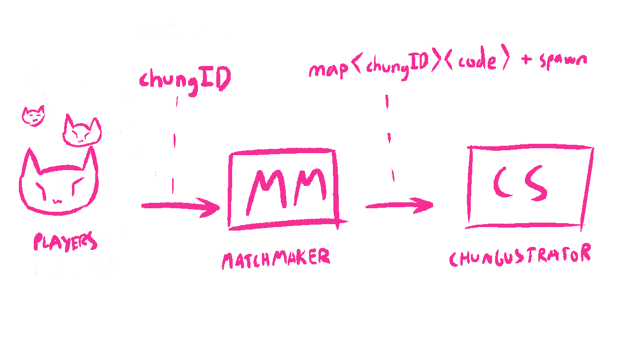 Matchmaking. The player joins queue through websocket holding data such as their chungID, which is my version of the SteamID. Once a match is made, unique verification codes are generated for each player, and the matchmaker sends a message to the Chungustrator through gRPC saying spawn a game server for me please. Also, here’s the players’ chungIDs and verification codes!