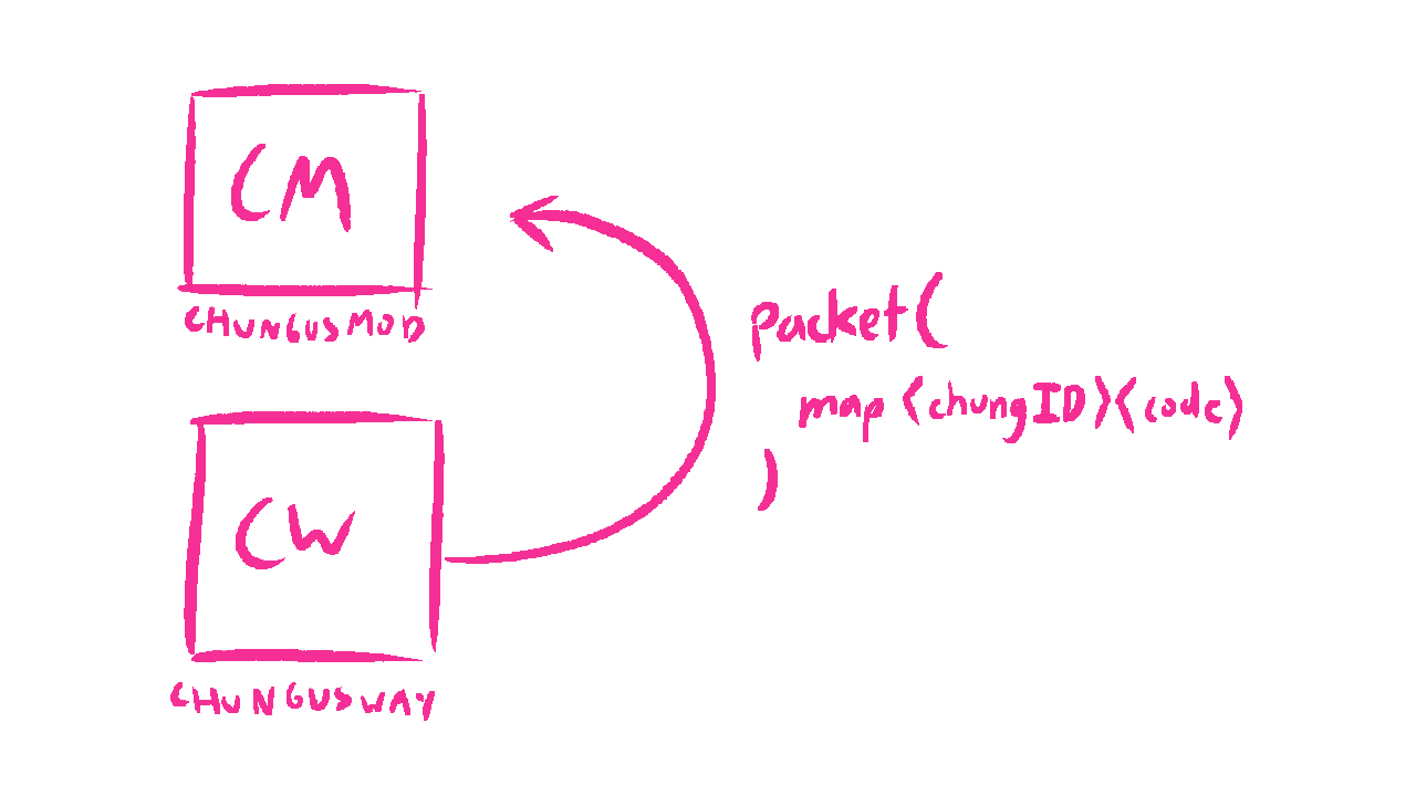 Chungusway. Receives message from Chungustrator, initializes an ENet client, makes an ENet connection to the game server using the address and port it has received, stuffs the mapped chungIDs and verification codes into a packet, and sends the packet to the game server on a channel exclusively for Chungusmod.