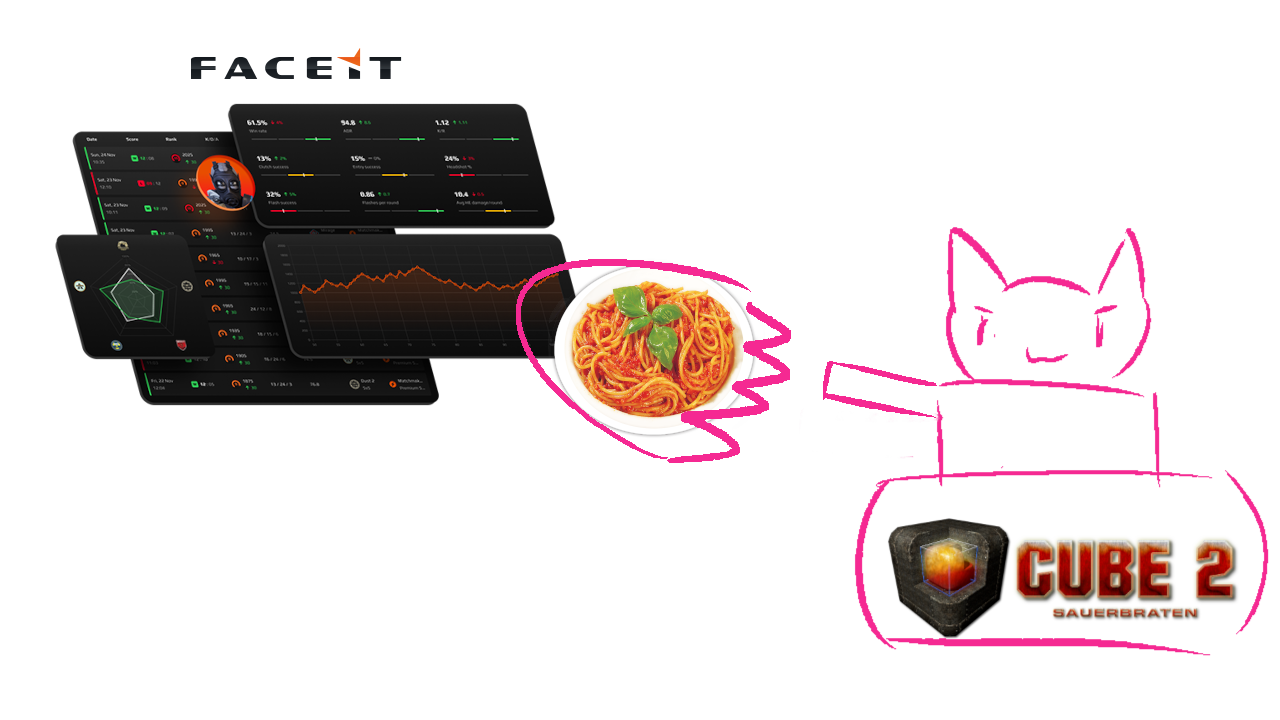 Chungus is the name of this multiplayer backend system that I’m building on top of this arena FPS, Cube 2: Sauerbraten. If you’re unfamiliar with Cube 2, it’s a neat open source game engine developed in 2004 with an in-game, real-time, and co-op map editor with Quake like gameplay. I specifically aim to replicate FACEIT, a third party competitive match making platform, mostly used for Counter Strike, where players get paired and play on FACEIT servers for rankings.
